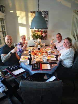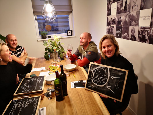 Wijn proeven in team verband: Een quiz versterkt het groepsgevoel en brengt wat actie en competitie in de groep.